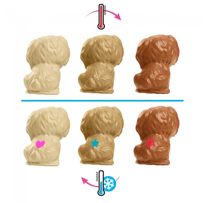 Допоможіть ляльці прийняти пологи у мами-собаки, для цього просто натисніть на спину тваринки. Після народження цуценят діти можуть наповнити ванну крижаною водою, потім занурити в неї рушник і провести по цуценятах, щоб на кожному з них з’явилась особлива родима пляма. Лялька Barbie може стати на коліна, що згинаються, щоб прийняти пологи у своєї улюблениці, а за допомогою чарівної переноски, яка вміщає всіх трьох цуценят, Barbie зможе дбати про них у дорозі чи брати з собою на прогулянку! Додаткові аксесуари включають пляшку, дві щітки, іграшку-мотузку, два смаколики, пакет із кормом для собак і миску.