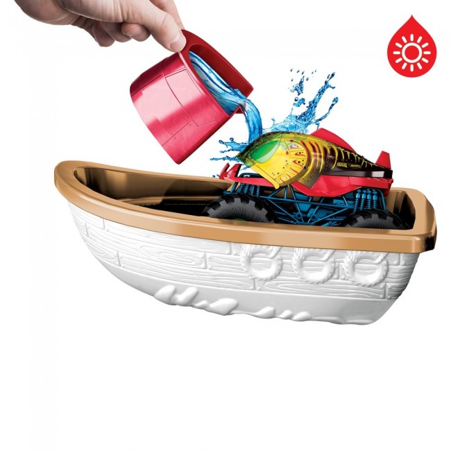 Демонструйте приголомшливі трюки з ігровим набором "Атака крокодила" серії "Зміни колір" Hot Wheels® Monster Trucks, з яким на вас чекає сплеск неймовірних емоцій і хвиля кольорових несподіванок! Запустіть машинку "Пірань-ахх" серії "Зміни колір", і спостерігайте, як вона впаде в пащу крокодила, повну крижаної води, і набуде іншого забарвлення, змінившися до невпізнання. Запустіть машинку ще раз, і коли вона проб’є знак і впаде в човен, де її можна полити теплою водою, її забарвлення зміниться знову! Повторюйте цей трюк знов і знов для нескінченних перевтілень! Знімний резервуар на носі човна й чаша в пащі крокодила запобігають проливанню води, завдяки чому вона не потрапляє за межі ігрової зони. Кольори й зовнішній вигляд можуть відрізнятися.