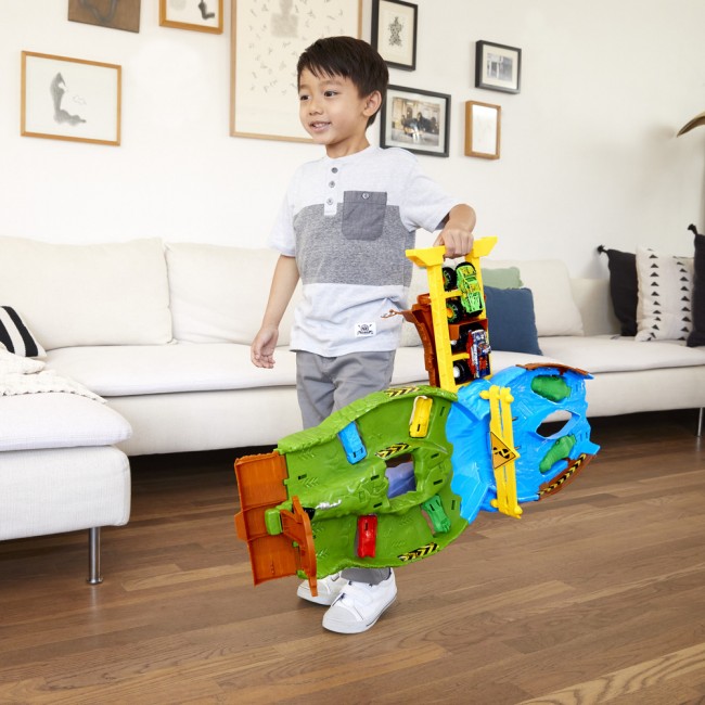 Дізнайтеся, котра машинка є найшвидшою та найпотужнішою, влаштувавши "Перегони титанів" з ігровим набором від Hot Wheels® Monster Trucks! "Біґфут" і "Ґанкстер" стрімголов спускаються крутим схилом гори, "розтрощуючи" на своєму шляху уламки машинок й долаючи серію перешкод, серед яких є небезпека атаки алігаторів, щоб урешті досягти печери й отримати омріяний кубок чемпіонів. Перший позашляховик, що опиниться на мості, запускає підняття платформи, від якого друга машинка — а також коментатор перегонів — злітають у повітря. Обираючи інші машинки (продаються окремо), діти тестуватимуть як зміна транспорту впливатиме на результат. Набір складається для зручного перенесення та зберігання. Ці перегони натхнені епічними швидкісними спусками з серії відео про машинки-позашляховики Monster Trucks на YouTube-каналі Hot Wheels®, а також спонукають дітей вигадувати усе нові та нові пригоди. Кольори й зовнішній вигляд можуть відрізнятися.