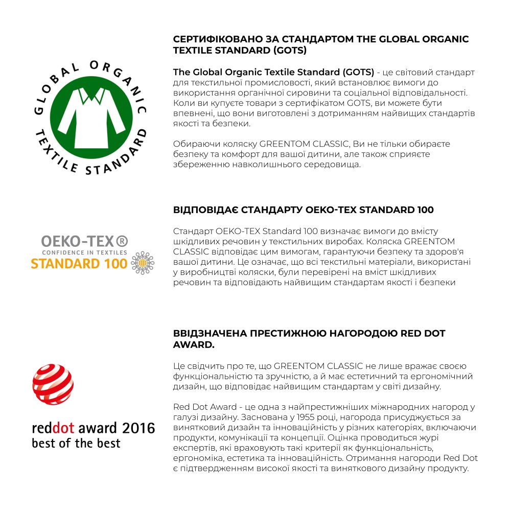 Текстильні матеріали коляски Greentom Classic піддаються якісній фарбуванні, що забезпечує стійкість кольору під час прання. Ви можете бути впевнені, що ваша коляска залишиться яскравою та привабливою протягом тривалого часу.