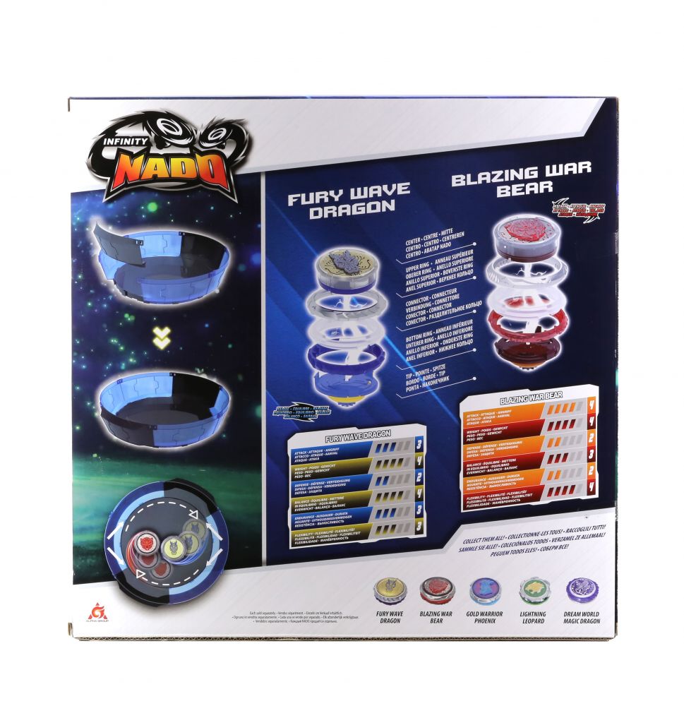 Infinity Nado VI Battle Set – ігровий набір з дзиґами нового 6 покоління що зазнала значних вдосконаленнь що беззаперечно подарують нові емоції від ще більш видовищних та цікавих поєдинків. Абсолютно нова система запуску дзиґи на арену реалізована з допомогою епічного лаунчера у вигляді меча, пускова система покликана забезпечить контрольований швидкісний запуск. Нова бойова арена має вдосконалене покриття та складну конструкцію для більш зручного зберігання між захопливими баталіями. До складу набору входять дві дзиґи Fury Wave Dragon і Blazing War з LED-підсвічуванням, два пускових лаунчера у вигляді мечів і ігрової арени.