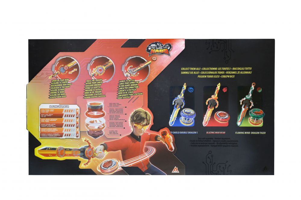 Infinity Nado VI серії Split Series – дзиґа нового 6 покоління зазнала значних вдосконаленнь що беззаперечно подарують нові емоції від ще більш видовищних та цікавих поєдинків. Абсолютно нова система запуску дзиґи на арену реалізована з допомогою епічного лаунчера у вигляді меча що має більший розмір і вдосконалений зовнішній вигляд, пускова система покликана забезпечить контрольований швидкісний запуск.