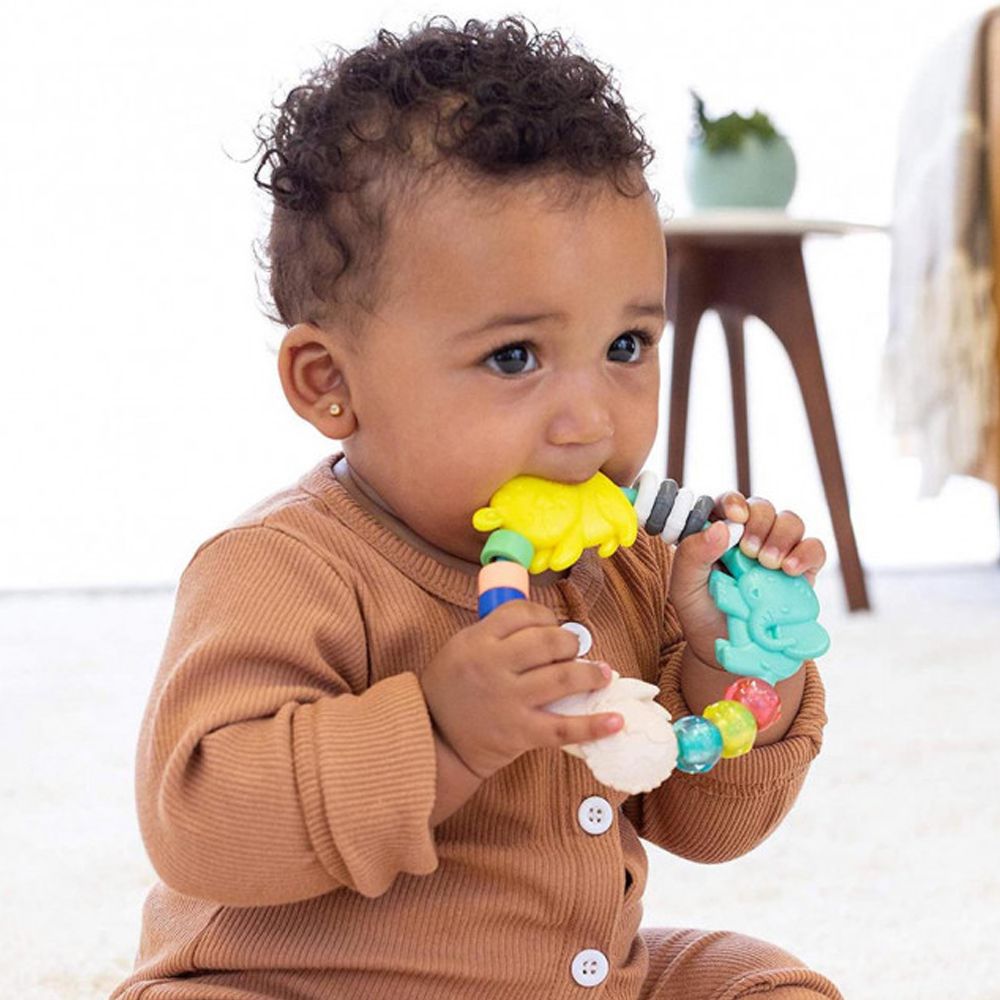 Прорізувач для зубів Друзі-звірята зручно тримати маленькими долоньками. Звіряток можна гризти та одночасно масажувати ними ясна, допомагаючи малюкові впоратися зі складним періодом появи зубів. Яскраві намистинки привернуть увагу малючка та стимулюватимуть кольоросприйняття.