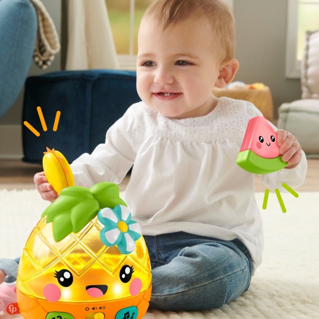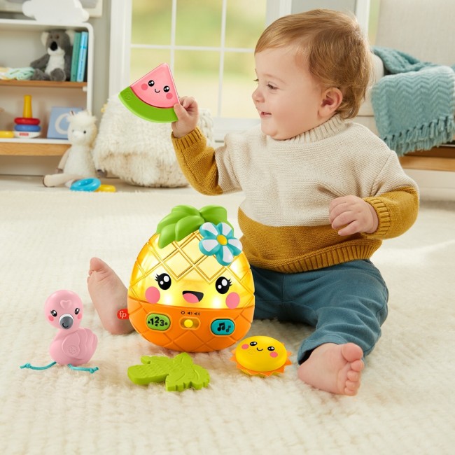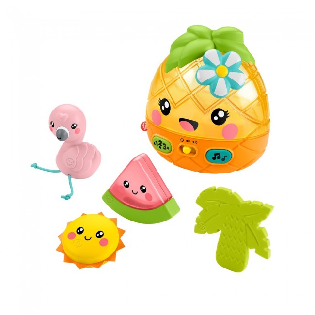 Музичний ігровий набір "Ананас та друзі" від Fisher-Price перетворить кімнату малюка у справжній тропічний рай! До набору входять три брязкальця у вигляді сонечка, шматочка кавуна та фламінго з м’якенькими ніжками-шнурочками, а також пальма-прорізувач. Поміщаючи тропічних друзів у хиткий ананас, дитина почує веселі звуки та бадьорі мелодії, та побачить яскраві вогники. Бажаєте ще розваг? Натискайте кнопки на ананасі, щоб почути більше тропічної музики, а також активувати пісні та навчальні фрази про кольори, цифри й фігури. Дітлахи можуть хапати, трясти та досліджувати іграшки, а також прокручувати барвисту квітку на голові жовтогарячого красунчика. Іграшка відтворює понад 35 пісень, звуків, мелодій та фраз англійською мовою.