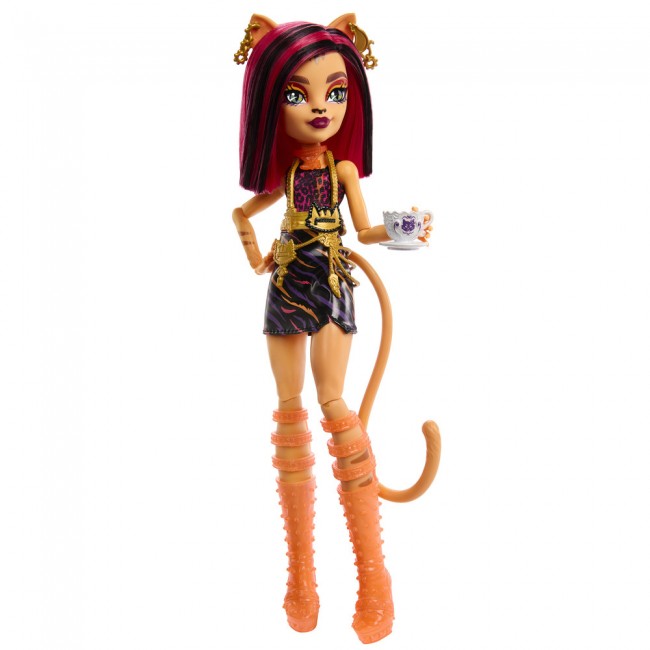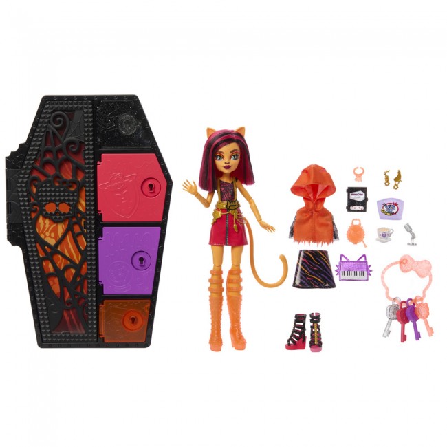 Час дізнатись, що за секрети ховаються у шафі монстро-учениці Торелай, доньки Веркішки! Відкрийте найбільший відсік. Вау, всередині неперевершена лялька Торелай. Вона вбрана у бомбезний наряд - топ з оригінальним принтом, блискучу високу спідницю під латекс, стильний аксесуар-портупею, а також високі неонові чоботи з крутим дизайном підборів.