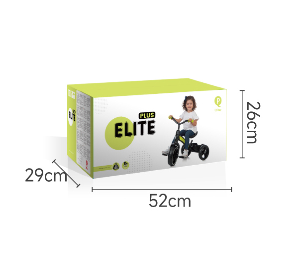 Elite Plus — це легкий, маневрений триколісний велосипед зі знімною батьківською ручкою. Велосипед розроблено відповідно до суворих стандартів безпеки. Сталева рама з захисними пластиковими деталями, має обтічну форму, що знижує опір повітря та безпечне використання. Батьківська ручка регулюється по довжині, а коли дитина підросте, її можна демонтувати - створюючи класичний триколісний велосипед. Переднє колесо біговела має діаметр 10 дюймів (25,4 см), а задні колеса — 8,5 дюймів (21,6 см). Завдяки такій конфігурації забезпечується оптимальна стійкість і маневреність. Велике переднє колесо легко долає нерівності дороги, а компактніші задні додають легкості управлінню та комфортного катання на будь-якій поверхні.