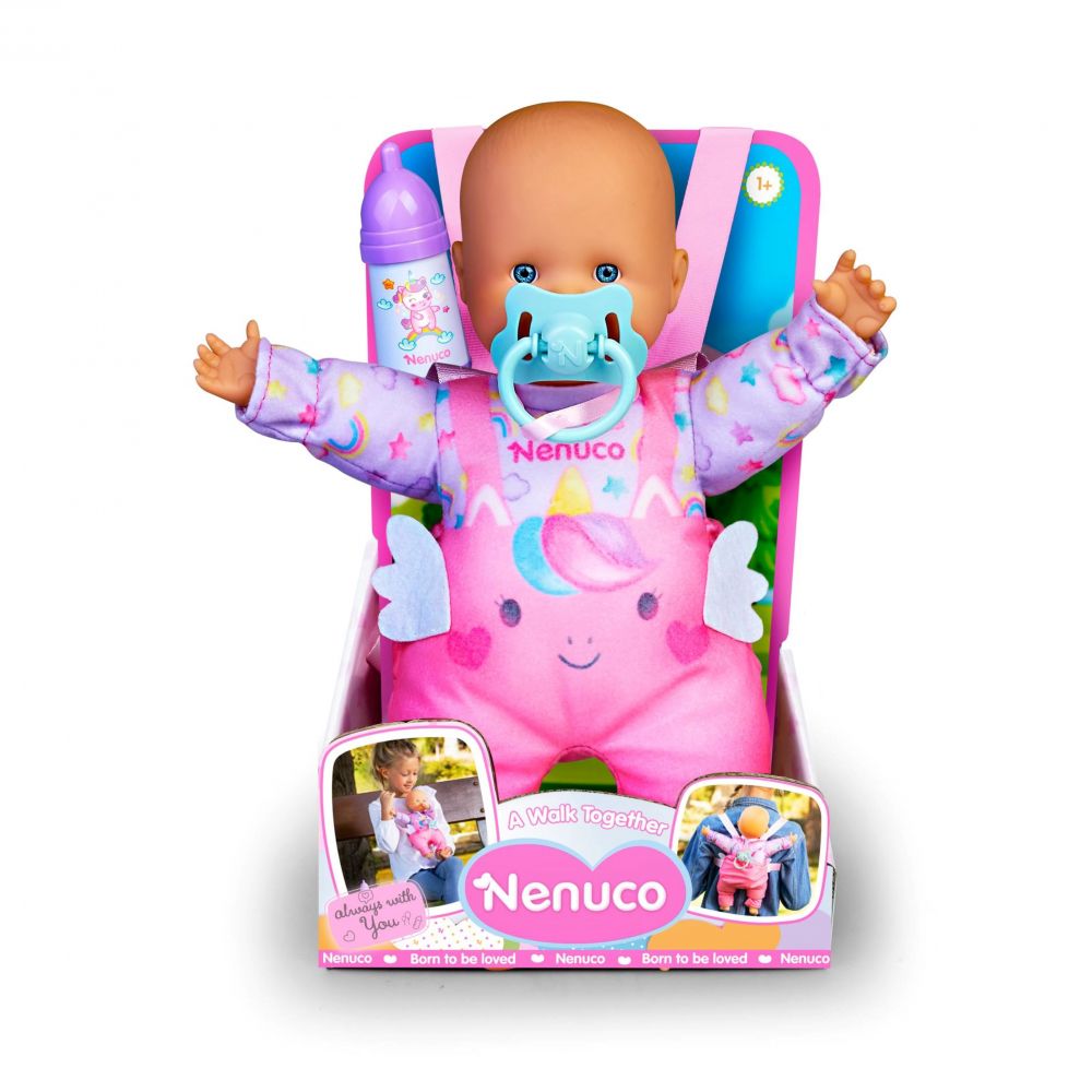 Nenuco готова к прогулке! Кукла-пупс высотой 35 см с мягким туловищем, бутылочкой, пустышкой и двумя ремешками на одежде для удобной прогулки с мамой.