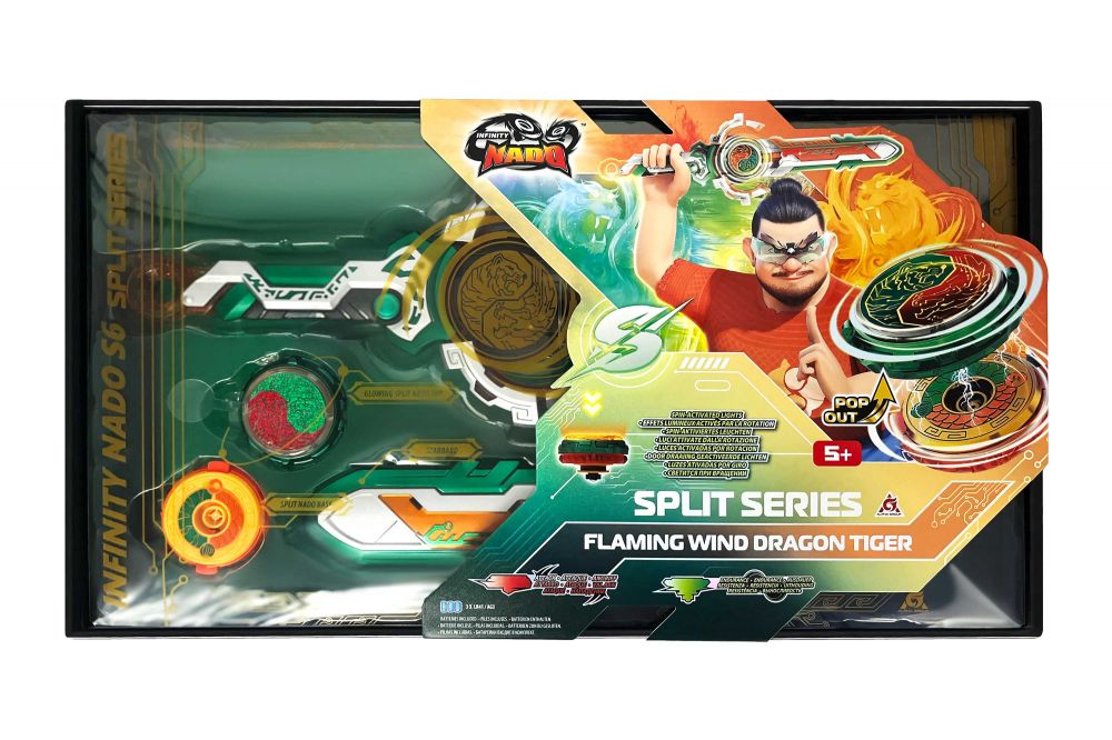 Infinity Nado VI серии Split Series – волчок нового 6 поколения претерпела значительные усовершенствования, которые безоговорочно подарят новые эмоции от еще более зрелищных и интересных поединков. Совершенно новая система запуска волчка на арену реализована с помощью эпического лаунчера в виде меча, имеющего больший размер и усовершенствованный внешний вид, пусковая система призвана обеспечит контролируемый скоростной запуск.