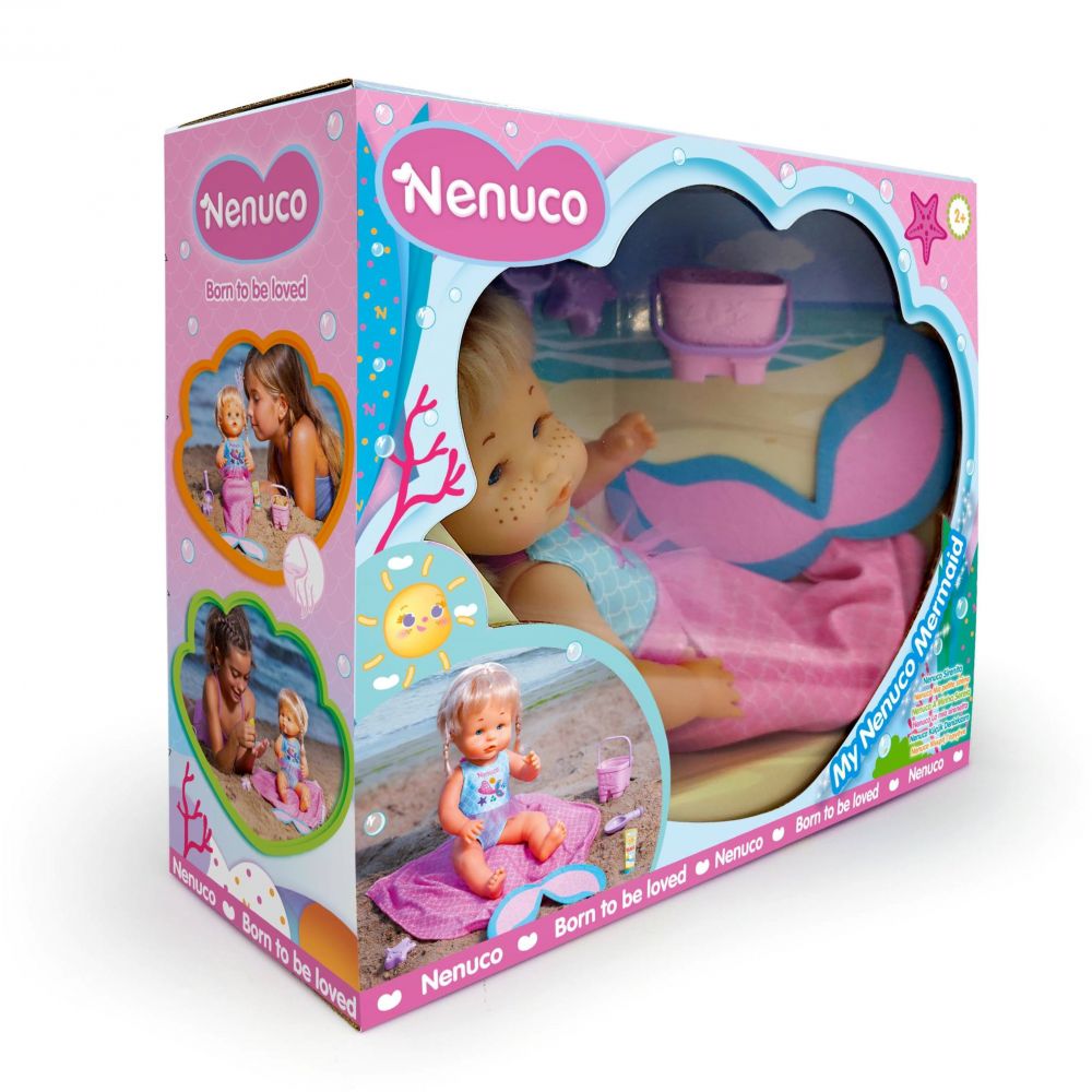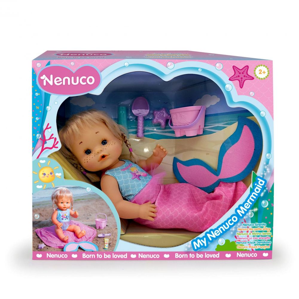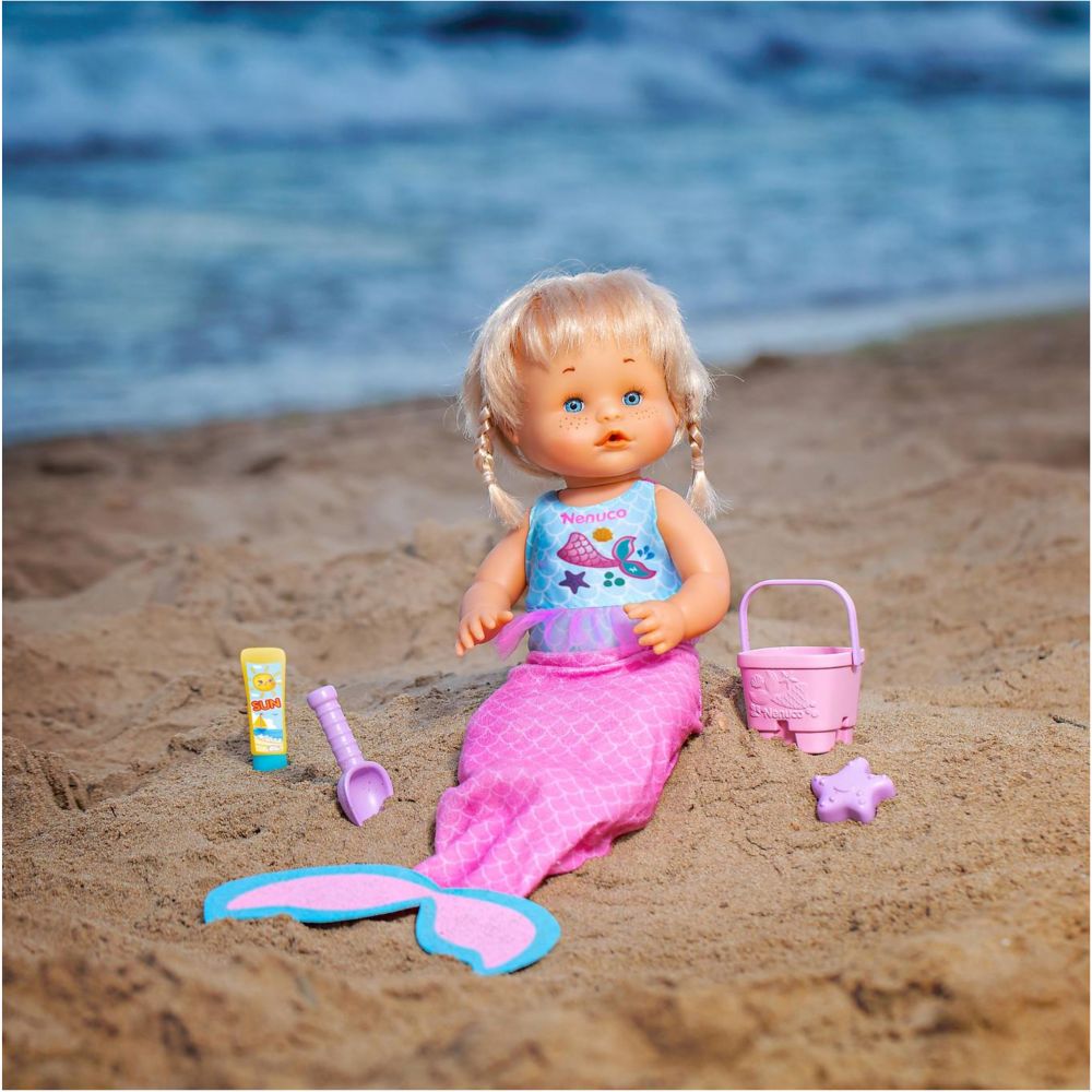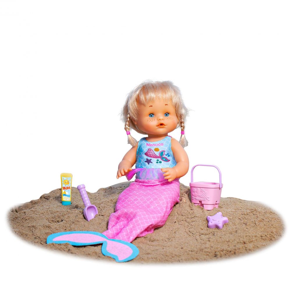 Лялька висотою 35 см з білявим волоссям та милим ластовинням на обличчі. Ненуко зібралася на пляж, взявши з собою пляжний рушничок у вигляді хвостика русалки та аксесуари для ігор у піску (лопатка, відерце та морська зірочка).