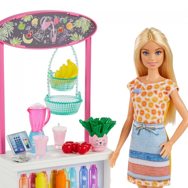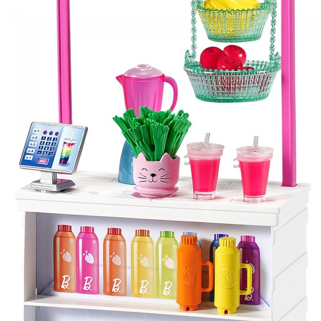 До комплекту входить лялька Barbie у милій сукні з фруктами та фартушком, стійка для приготування смузі та 10 аксесуарів: 2 стаканчики, що змінюють колір, зі знімними кришками, 2 пляшки, 2 набори фруктів, тримач для фруктових кошиків, блендер, касовий апарат і горщик у вигляді кота з паростками пшениці.