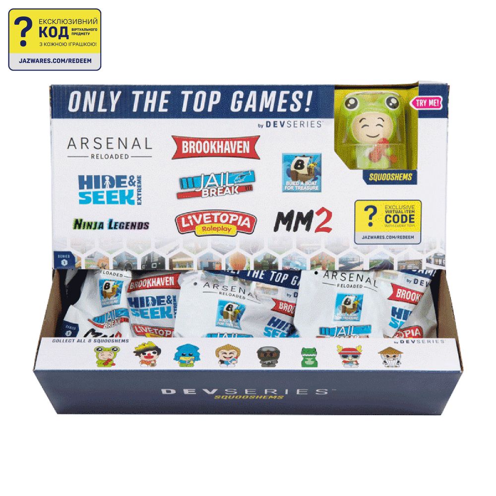 Хапайте та стискайте своїх улюблених ігрових персонажів DevSeries Squooshems. Упаковка повністю закрита, вміст прихований, котрий з героїв тапиться, сюрприз. Кожне паковання містить одну із восьми 6 сантиметрових сквішів, найвідоміших ігрових персонажів з топових Roblox ігор: Sparkplug із Brookhaven, Nikilis із Murder Mystery 2, SWAT Pass Gamer із Jailbreak, Froggy із Arsenal Reloaded, Zeg із Build A Boat For Treasure , Playground T-Rex із Livetopia, Ethan із Hide and Seek Extreme та Sensei із Ninja Legends. Кожен Squooshems виготовлено з м’якого матеріалу, який при стисканні змінює форму, що робить його ідеальним компаньйоном під час гри, або стане прикрасою вашого столу, книжкової полиці або ліжка. Також ігрові фігурки-сквіші у комплекті мають ексклюзивний віртуальний код предмета, який відкриває унікальний аксесуар для вашого Roblox аватара, доступний лише у DevSeries. Зберіть усі вісім улюблених персонажів Squooshem від DevSeries. Офіційно ліцензований продукт від Jazwares.