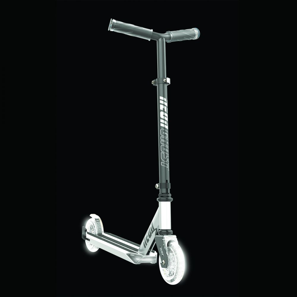 Самокат Neon Ghost N101166 10 кольорів, 1 скутер! Neon Ghost оснащений світлодіодним підсвічуванням, міцною і легкою алюмінієвою декою, зручними прозорими ручками і світяться RGB світлодіодними колесами що роблять цей самокат одним з найкрутіших у всьому світі. • 10 різних кольорів і 3 різних режиму: налаштуйте підсвічування за допомогою керованого динамічного освітлення. Встановіть імпульсний або стробоскопический режим у всіх кольорах або виберіть ваш улюблений колір простим натисканням кнопки. • Телескопічний кермо, можна регулювати по мірі зростання вашої дитини, забезпечуючи кращу посадку для дітей від 5 років або до 45 кг. • Надійно і безпечно: Neon Ghost поставляється з нековзними насадками на кермі, міцної декою і великим заднім гальмом для мнгоновенной зупинки.