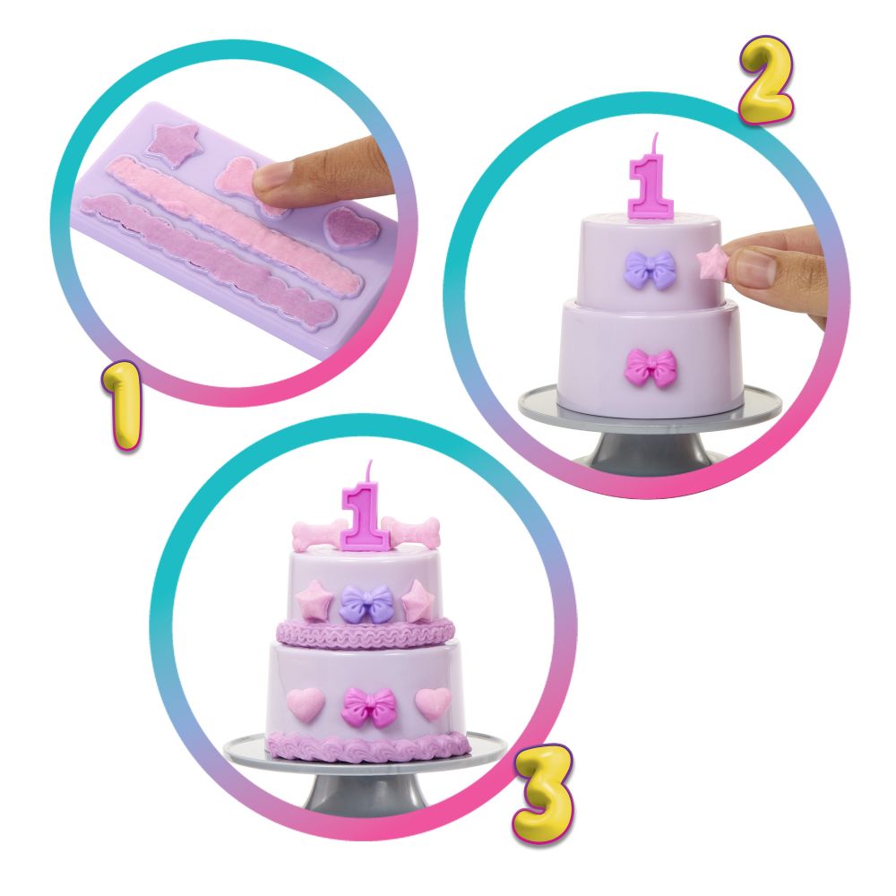 • щойно кулька буде готова, використовуйте спеціальну дошку з формами, щоб створювати різноманітні декоративні елементи та прикрасити чудовий двоярусний торт для свята! І це ще не всі сюрпризи! Час додати магії у гру. За допомогою теплої води ви можете прибрати кольорові пасма волосся Barbie або змити святковий мейкап. А за допомогою холодної води (або кубика льоду) знову проявіть всі кольорові ефекти. Цей цікавий експеримент можна проводити безліч разів!