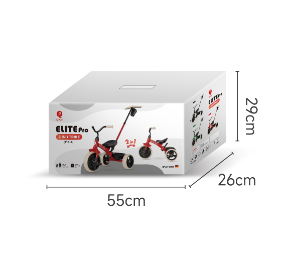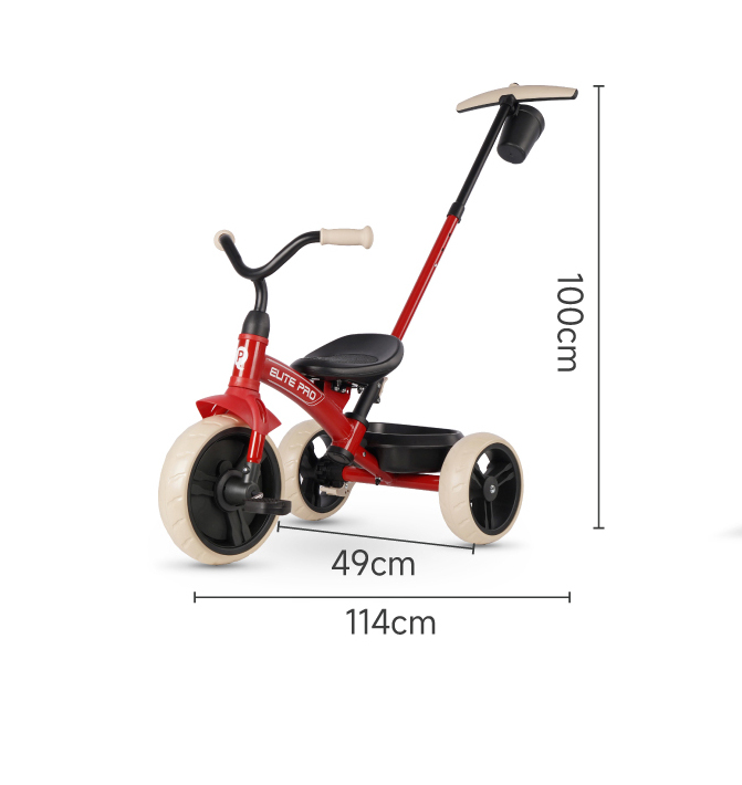 Elit Pro- це легкий, маневрений триколісний велосипед зі знімною батьківською ручкою, кошиком для іграшок та підстаканником. Сталева рама з захисними пластиковими деталями, має обтічну форму, що знижує опір повітря та безпечне використання. Батьківська ручка регулюється по довжині, а коли дитина підросте, її можна демонтувати - створюючи класичний триколісний велосипед. Переднє колесо біговела має діаметр 10 дюймів (25,4 см), а задні колеса — 8,5 дюймів (21,6 см). Завдяки такій конфігурації забезпечується оптимальна стійкість і маневреність. Велике переднє колесо легко долає нерівності дороги, а компактніші задні додають легкості управлінню та комфортного катання на будь-якій поверхні.